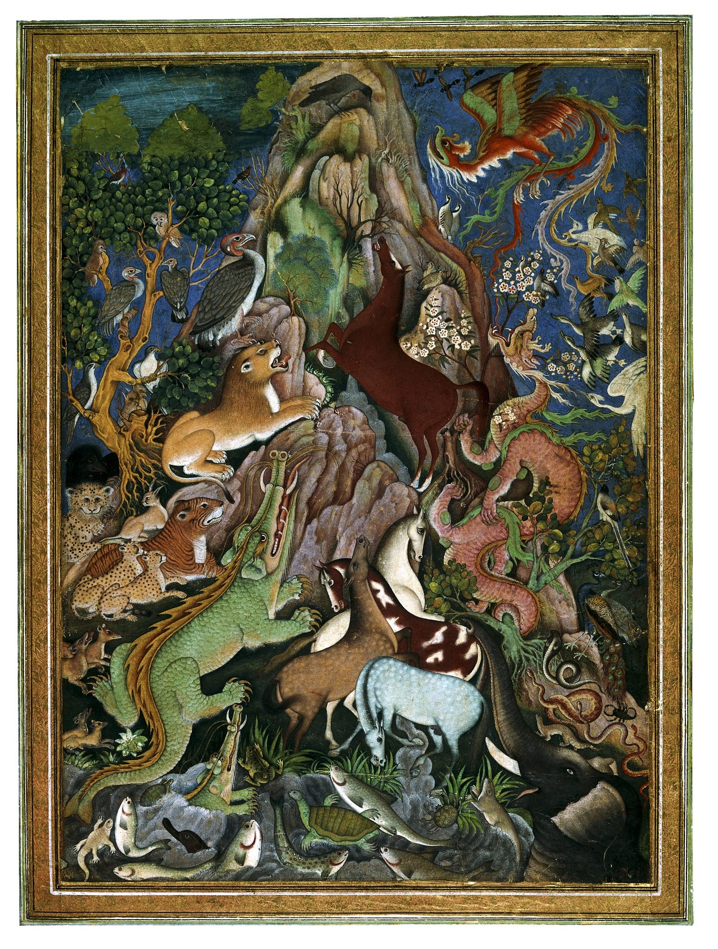 This scene may illustrate a variant of the episode in the Anwar-i Suhayli of the crow addressing the birds to rally their support against the leader of the owls. Real animals are combined with dragons and the simurgh, or phoenix.